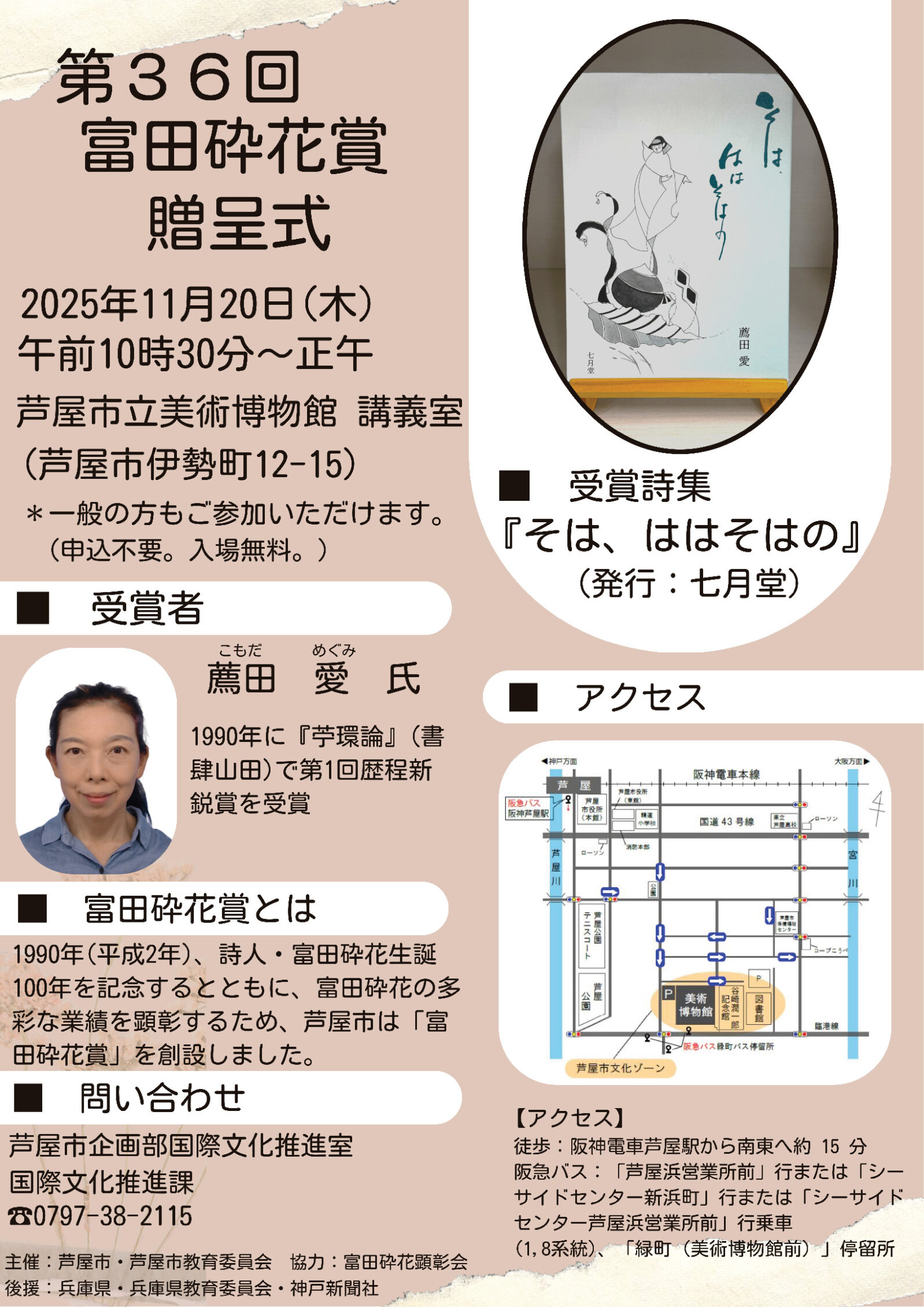 「富田砕花賞」は、平成2年に富田砕花生誕百年・芦屋市制施行50周年を記念して創設し、毎年全国から多くの応募があり、この賞にふさわしい詩集を決定してきました。