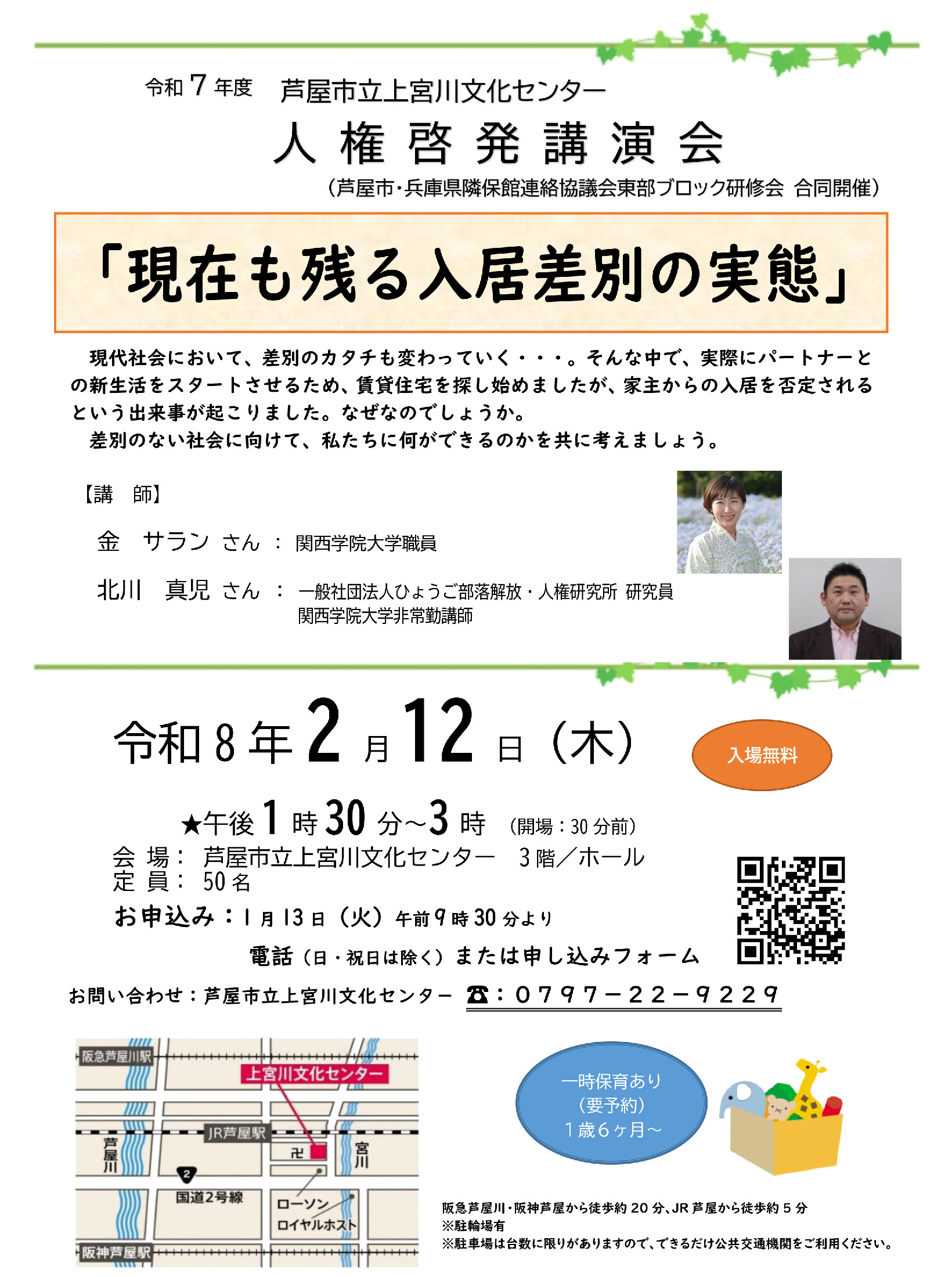 または下記関連リンク「令和7年度芦屋市立上宮川文化センター人権啓発講演会申し込みフォーム」よりお申し込みください。