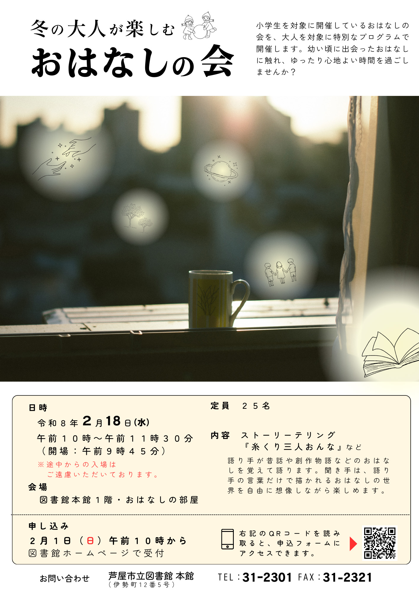 小学生を対象に開催しているおはなしの会を、大人を対象に特別なプログラムで開催します。幼い頃に出会ったおはなしに触れ、ゆったり心地よい時間を過ごしませんか?