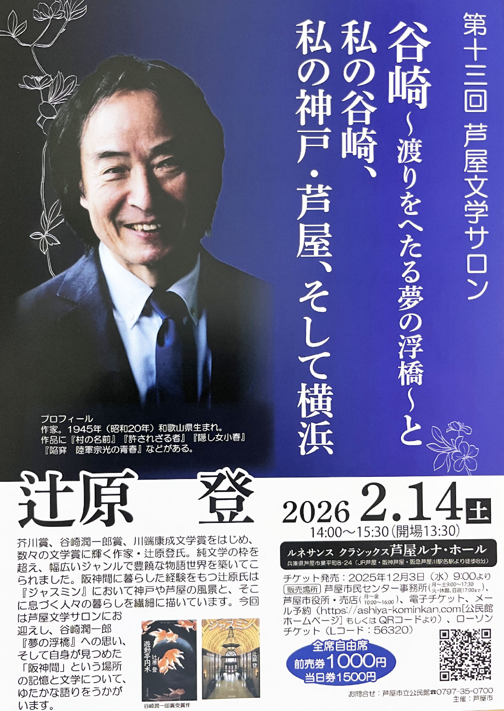 芥川賞、谷崎潤一郎賞、川端康成文学賞をはじめ、数々の文学賞に輝く作家・辻原登氏。純文学の枠を超え、幅広いジャンルで豊饒な物語世界を築いてこられました。阪神間に暮らした経験をもつ辻原氏は『ジャスミン』において神戸と芦屋の風景と、そこに息づく人々の暮らしを繊細に描いています。今回は芦屋文学サロンにお迎えし、谷崎潤一郎『夢の浮橋』への思い、そして自身が見つめた「阪神間」という場所の記憶と文学について、豊かな語りをうかがいます。