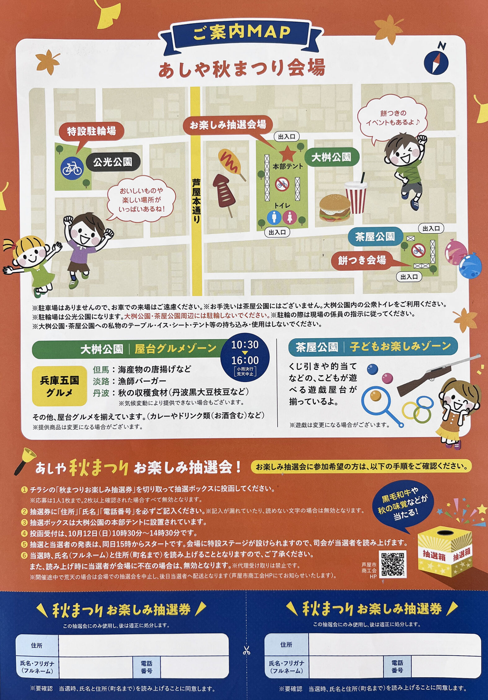 お楽しみ抽選会は大桝公園の本部テントで14:30までに抽選ボックスに投函してください。