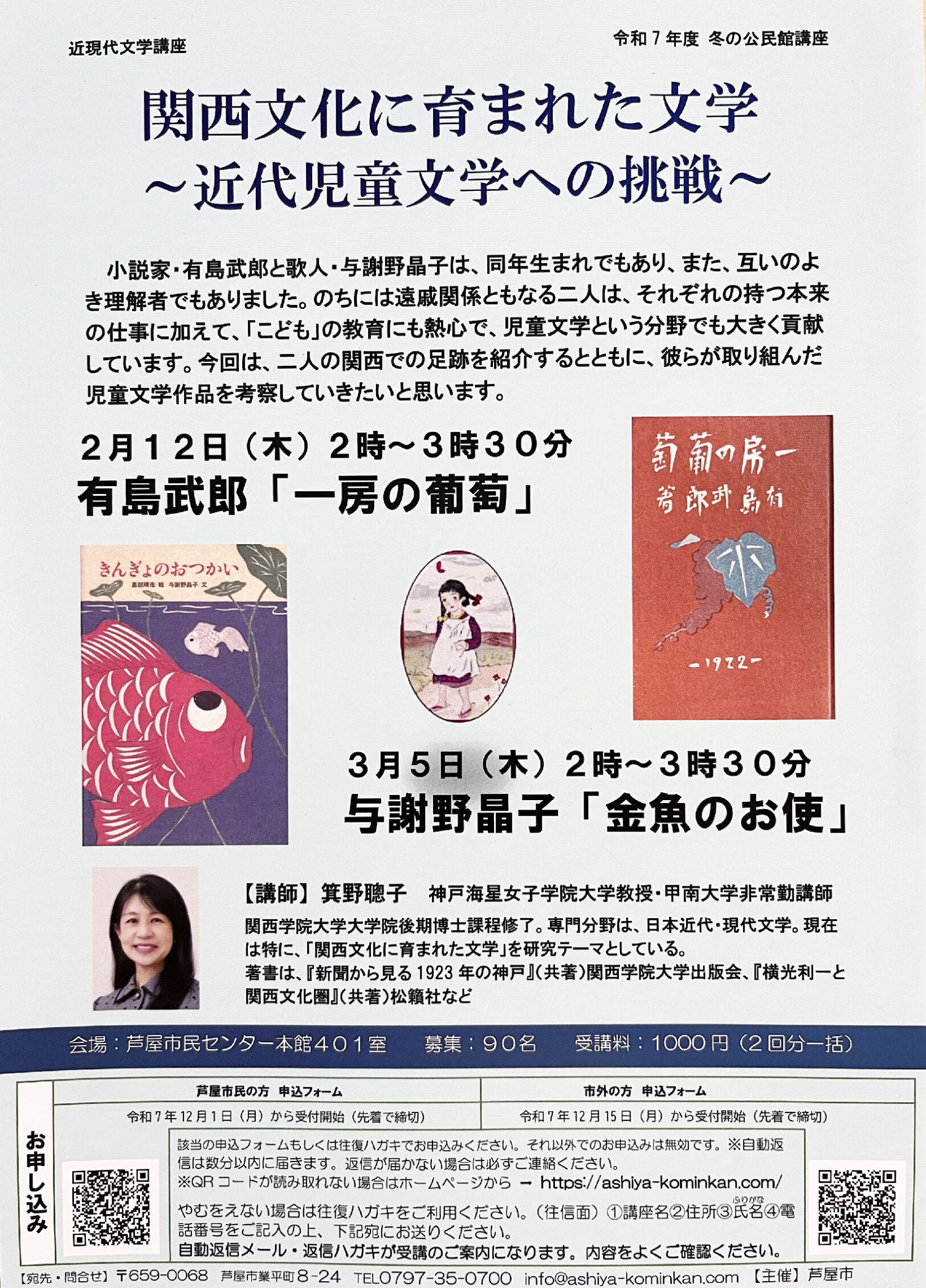 小説家・有島武郎と歌人・与謝野晶子は、同年生まれでもあり、また、互いのよき理解者でもありました。のちには縁戚関係ともなる二人は、それぞれの持つ本来の仕事に加えて。「こども」の教育にも熱心で、児童文学という分野でも大きく貢献しています。今回は、二人の関西での足跡を紹介するとともに、彼らが取り組んだ児童文学作品を考察していきたいと思います。