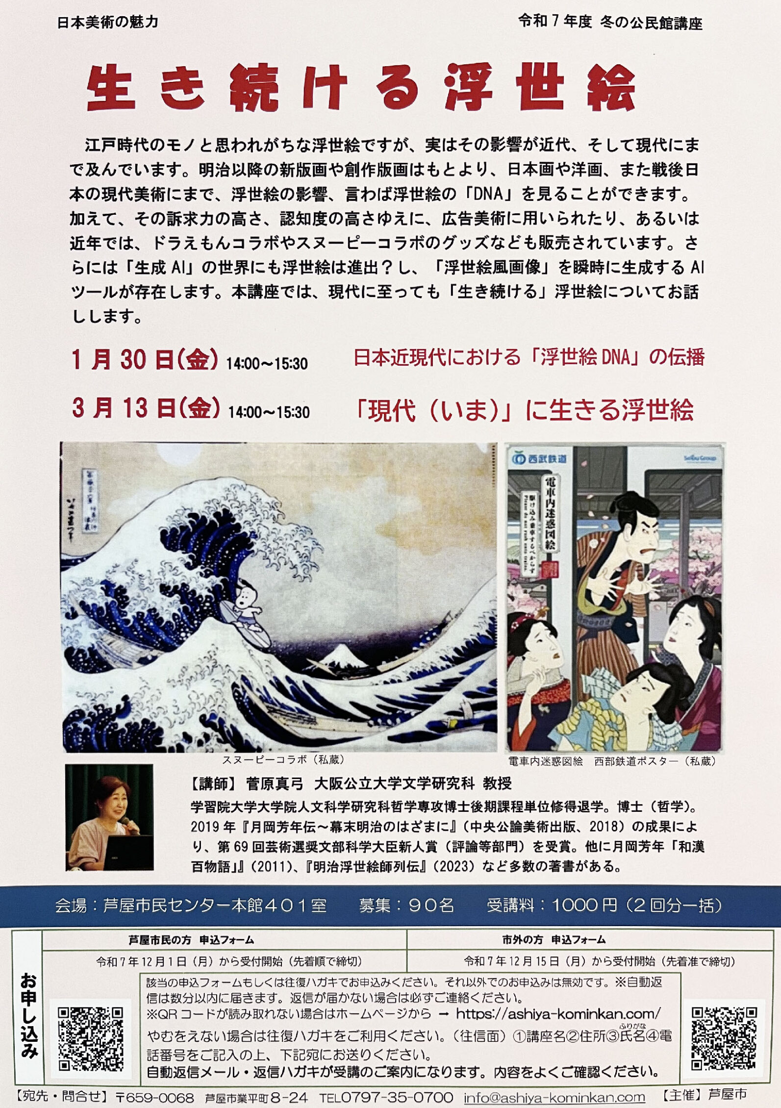 江戸時代のモノと思われがちな浮世絵ですが、実はその影響が近代、そして現代にまで汲んでいます。明治以降の新版画や創作版画はもとより、日本画や洋画、また戦後日本の現代美術にまで、浮世絵の影響、言わば浮世絵の「DNA」を見ることができます。加えて、その訴求力の高さ、認知度の高さゆえに、広告美術に用いられたり、あるいは近年では、ドラえもんコラボやスヌーピーコラボのグッズなども販売されています。さらには「生成AI」の世界にも浮世絵は進出?し、「浮世絵風画像」を瞬時に生成するAIツールが存在します。本講座では、現代に至っても「生き続ける」浮世絵についてお話しします。