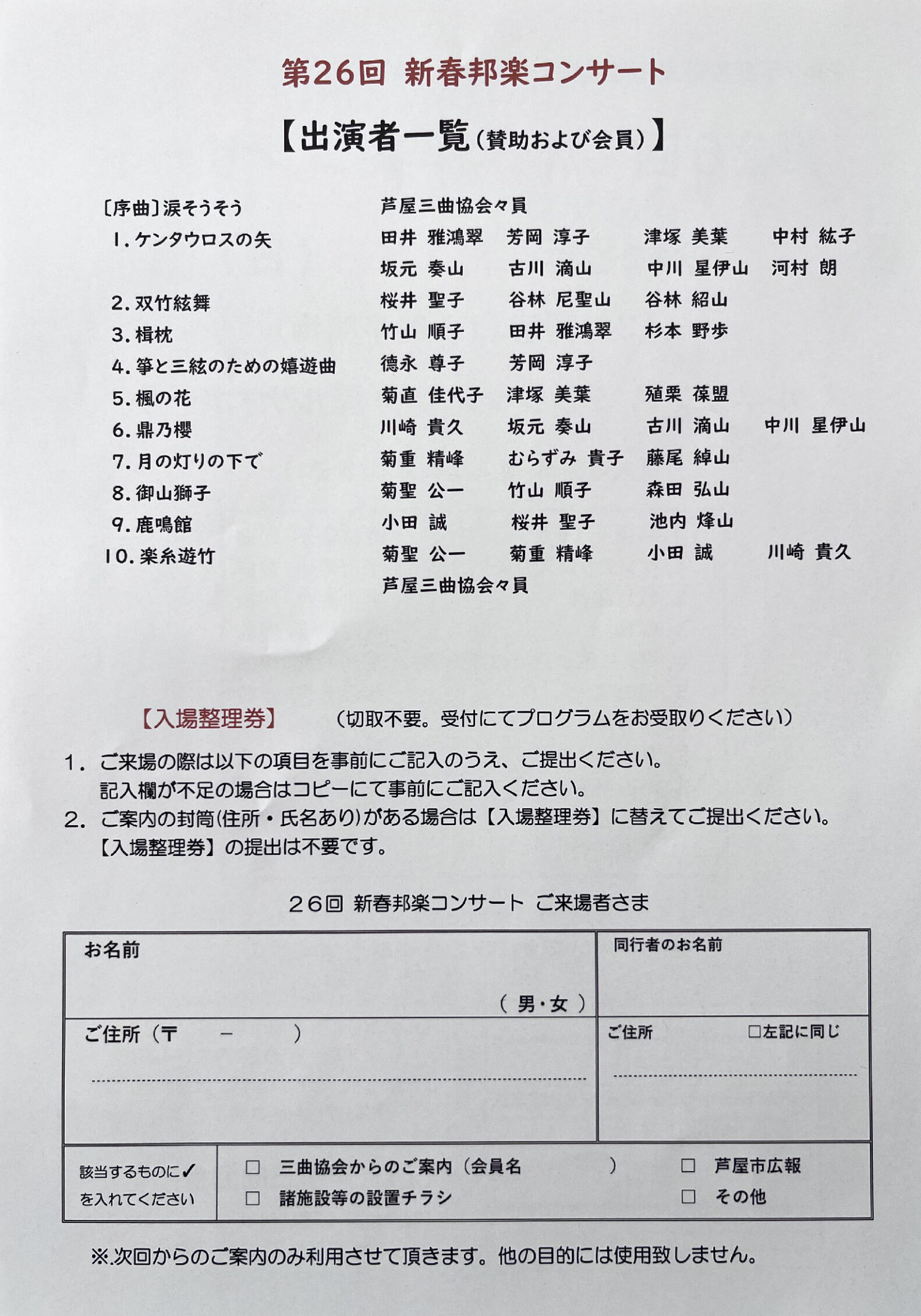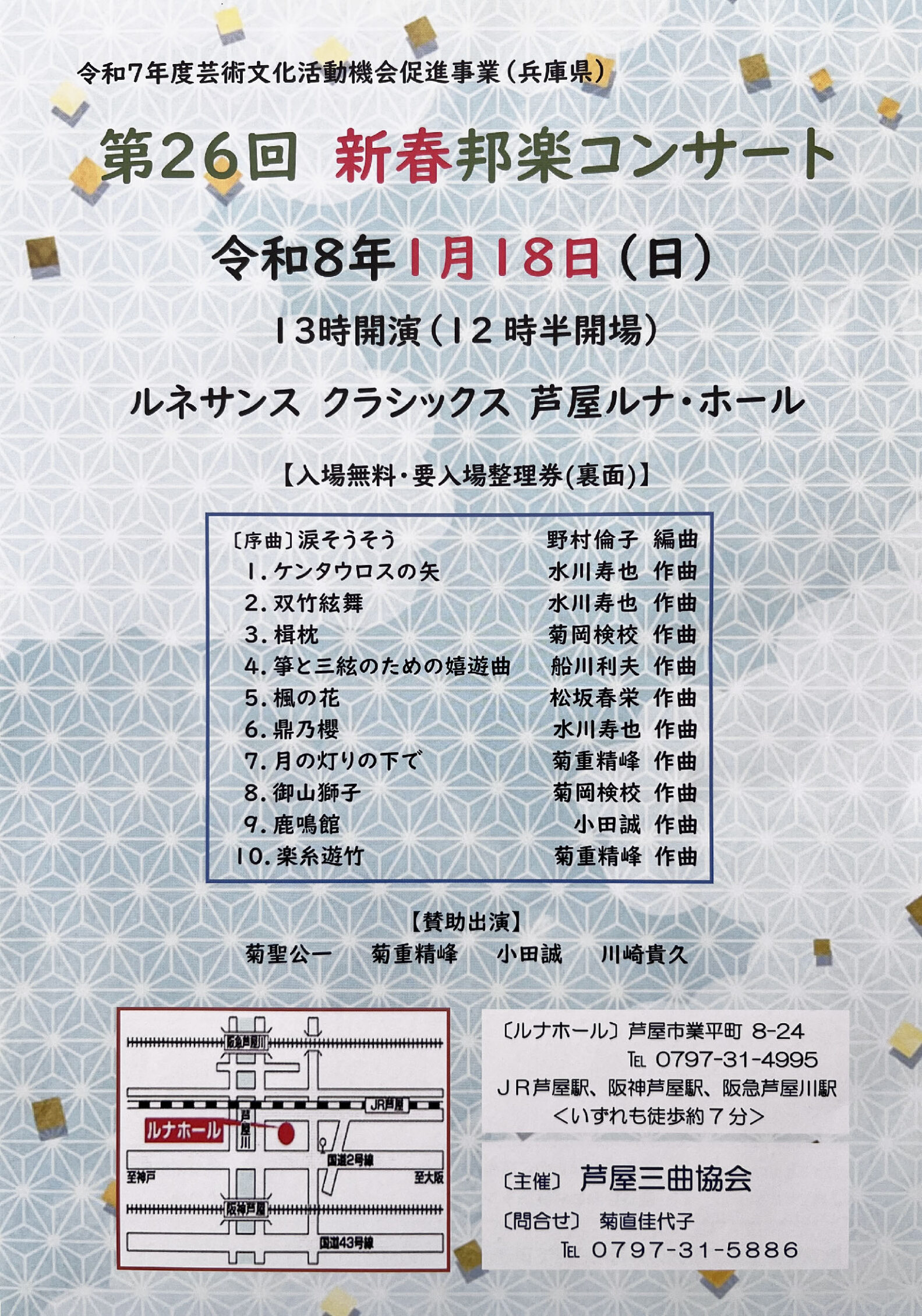 日時:2026年1月18日(日) 13:00開演 (12:30開場) 場所:ルネサンス クラシックス 芦屋ルナ・ホール 料金:無料※要入場整理券 主催:芦屋三曲協会