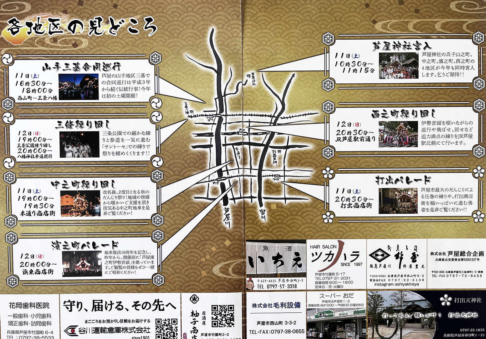 最後は本部前での一斉答礼を行い、あしや秋まつり会場(大桝公園)で地元中之町地区の見送りを受け各地区へ帰町いたします。