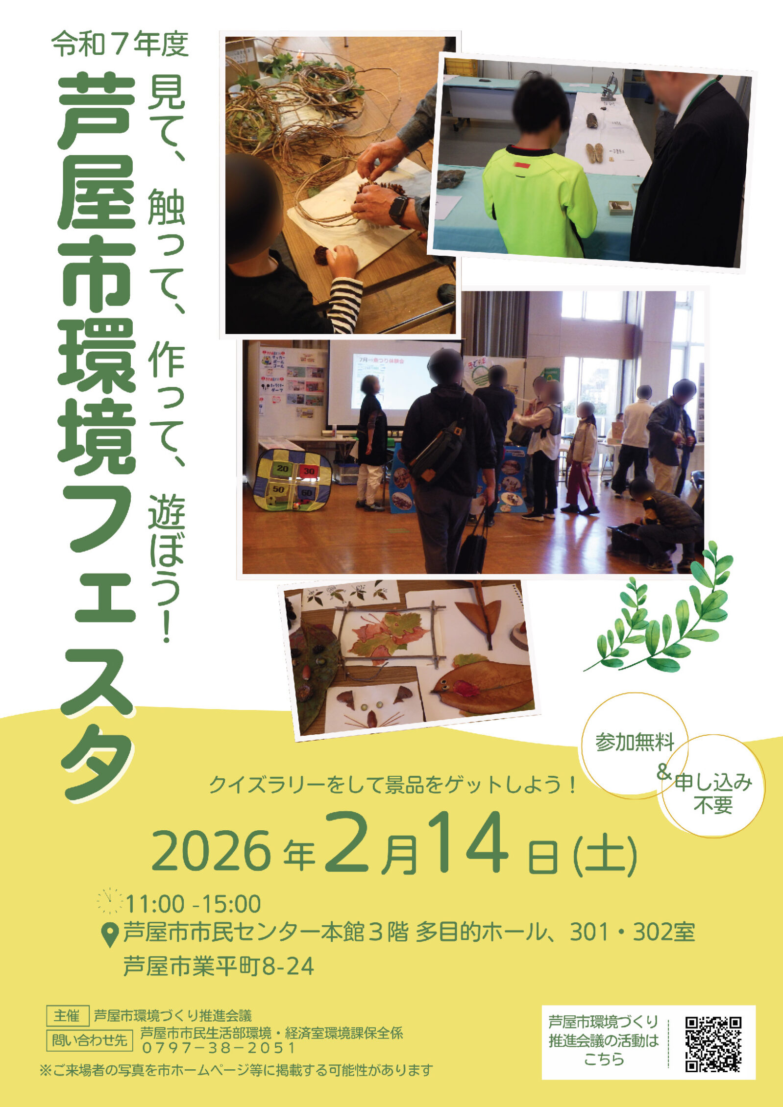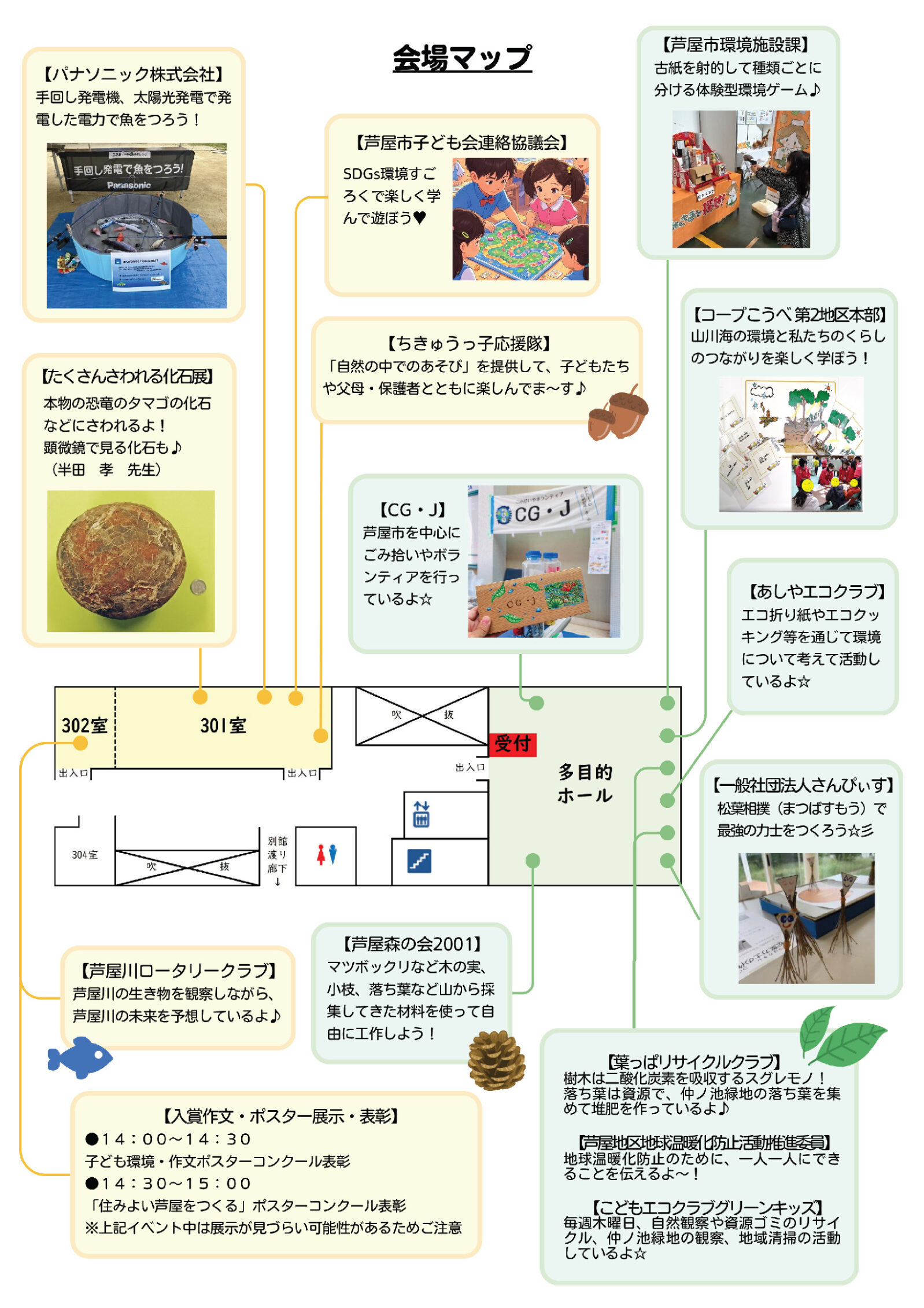 「子ども環境作文・ポスターコンクール」及び「「住みよい芦屋をつくる」ポスターコンクール」の展示は302室で実施しています。下記イベント中は展示が見づらい可能性があるためご注意ください。